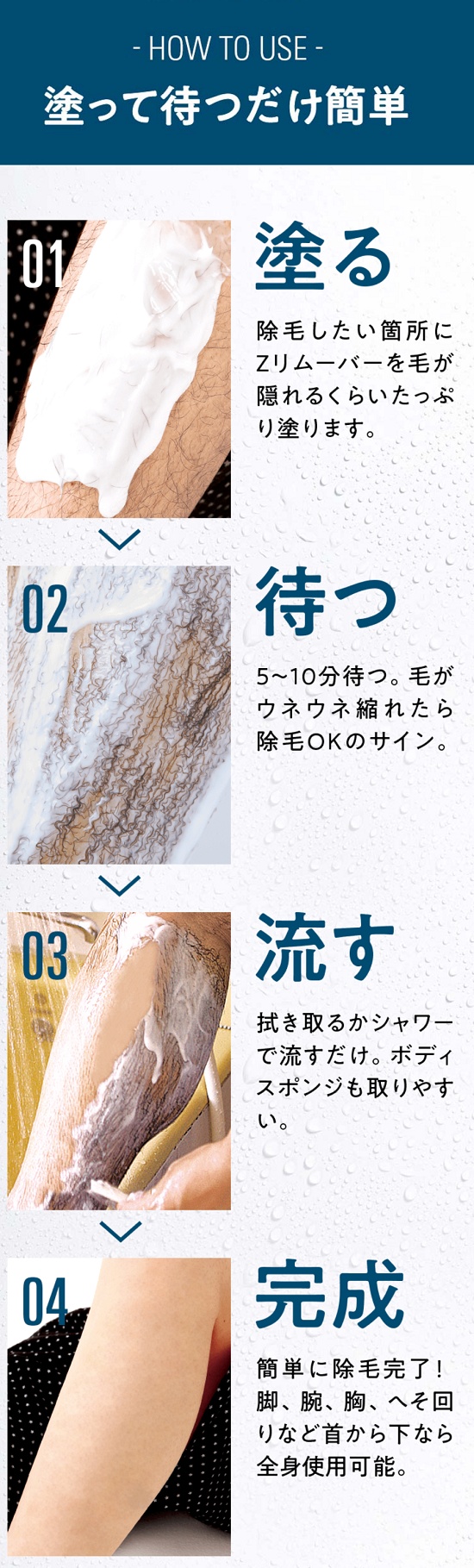 毛深い部分をしっかりと処理するにはチオグリコール酸カルシウムという成分が超重要!この成分がムダ毛のたんぱく質を分解することによって、ササっとふき取るかシャワーで洗い流すだけで面白いほどカンタンにムダ毛処理が完了!除毛クリームを選ぶときは、必ずチオグリコール酸カルシウムが含まれていることを確認する!