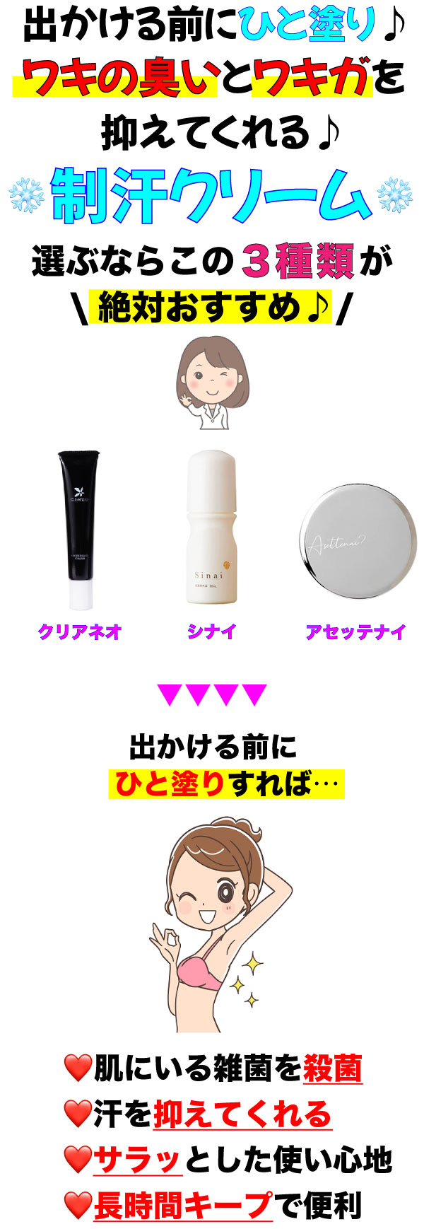 当サイトではドラッグストアやネット通販で購入できるワキガ対策アイテムを徹底調査した結果、本当におすすめできるワキガ向け制汗クリームを3種類ピックアップしました!ぜひ、参考にしてみてください♪