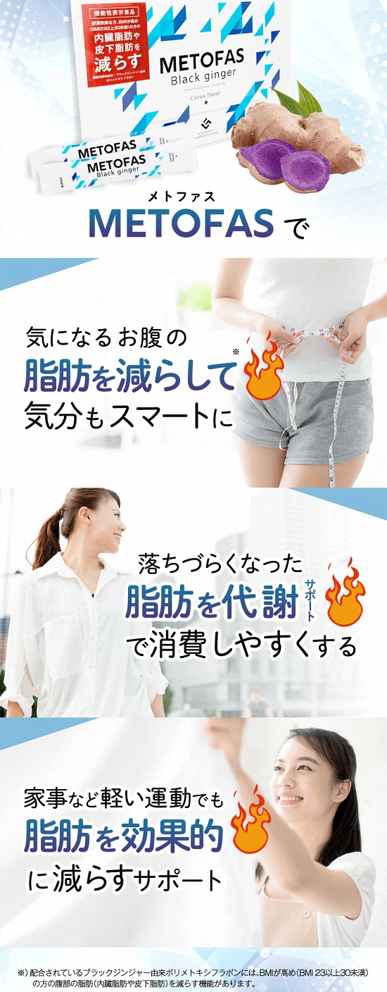 ◆お腹の脂肪を消費するブラックジンジャー配合のサプリ!いつもの生活にプラスするだけでOKだからお手軽なメトファス!