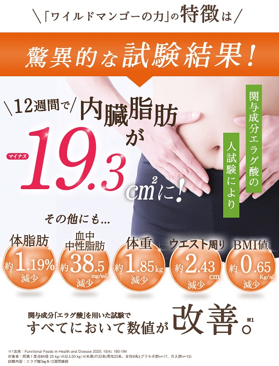 ◆実際の試験結果より、12週間で内臓脂肪がマイナス19.3㎠になったという報告データが出てる!