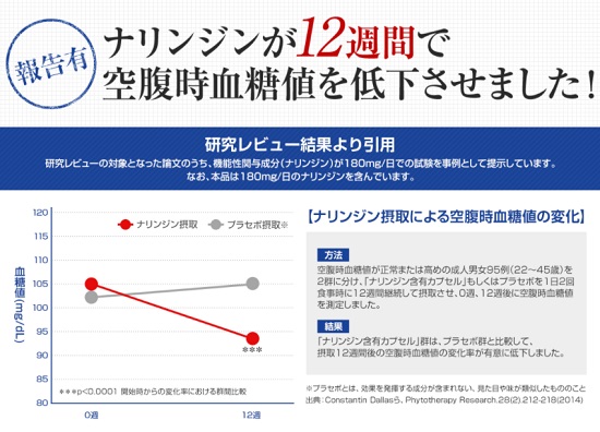 ◆機能性関与成分『ナリンジン』が12週間で空腹血糖値を低下させたデータを報告済!