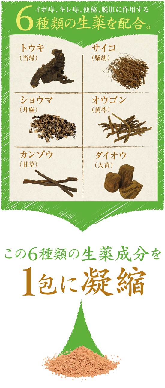 ◆イボ痔、キレ痔、便秘、脱肛に作用する生薬を6種類配合!