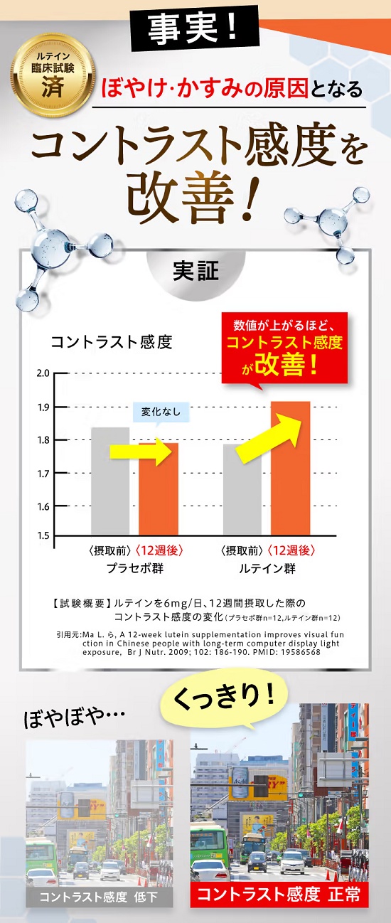 ◆ぼやけ、かすみ※が気になる人へ!コントラスト感度の改善機能が報告された注目サプリメント♪ ※ぼやけやかすみとは、光の乱反射によるコントラスト感度の低下を指します。