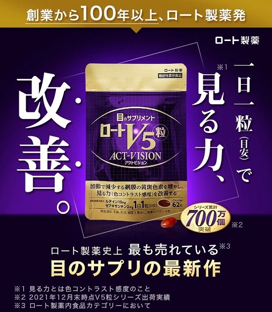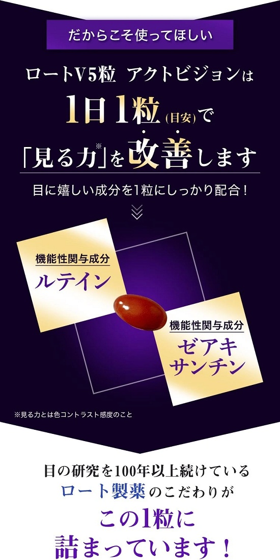 ◆迷ったらコレがおすすめ♪見る力(色コントラスト感度)を改善する機能のサプリメント!年齢と共に目のぼやけが気になる人はロートV5粒アクトビジョン!